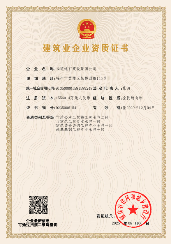 近日,福建地矿建设集团公司在资质升级工作方面取得重大突破,顺利完成“市政公用工程施工总承包贰级资质”与“环保工程专业承包贰级资质”的“一延五”工作,并取得福州市住房和城乡建设局颁发的证书。这一成果在集团公司发展历程中具有突破性意义,为其在建筑市场的长远发展注入了强大动力。
